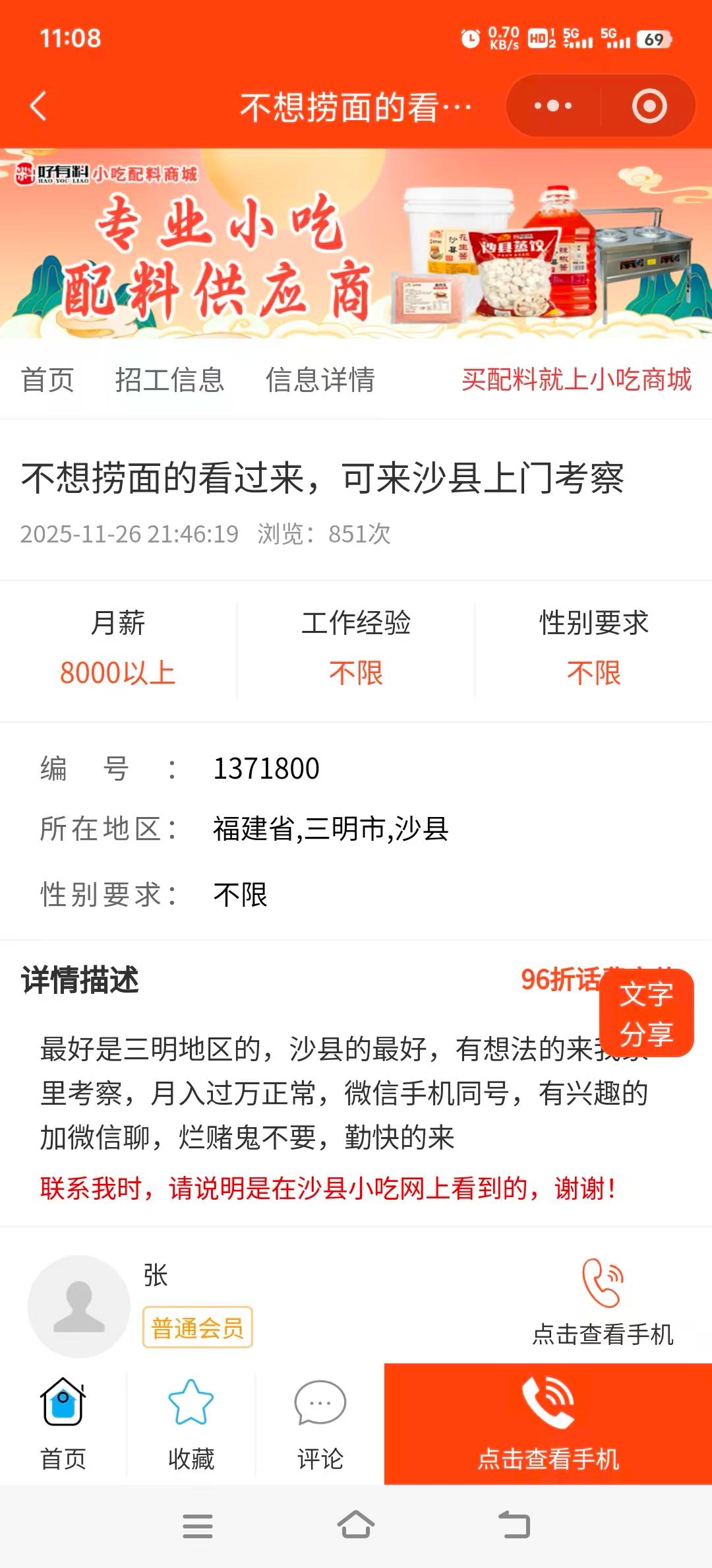 招单人师傅,男女不限,上班12小时,早上8点到晚上8点一次性上完,不用洗碗,工资8千! 要求:手脚麻利,年龄40岁以下,有责任心,对客户有笑脸,主要负责跑堂,打包外卖,饭点忙时帮忙站炒锅 老板年轻人好相处!具体可电话联系! (过年不回家优先!)